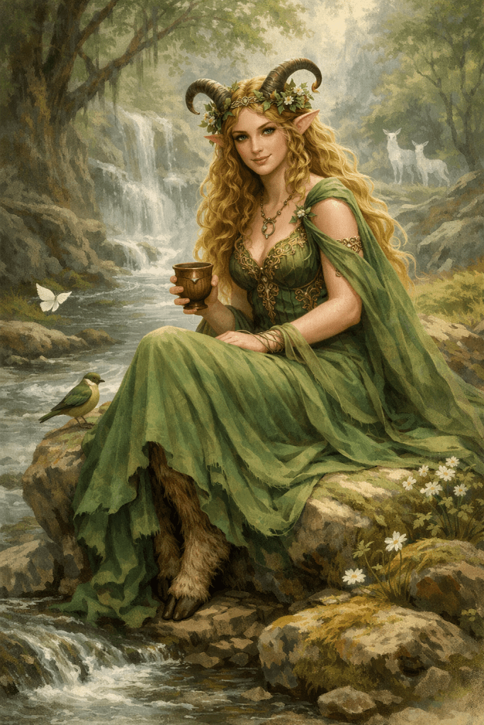 Folk tales vary concerning the Glaistig. She is half woman and half goat (lower half) being, living outdoors protecting both wild and domesticated animals. Her long golden hair falls into a green dress that hides these goat legs. She has malevolent, and benevolent characteristics.